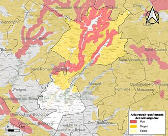 Own work avec les données : * Découpage administratif communal et départemental : Admin Express sur le site de l'IGN. * Fond de plan (Infrastructures, eau, sols, relief) : Plan IGN (licence ouverte Etalab 2.0 depuis le 1er janvier 2021) * aléa argile : périmètres de l'aléa publié par l'« Observatoire des risques naturels » Assemblé et enrichi dans fr:QGis. |